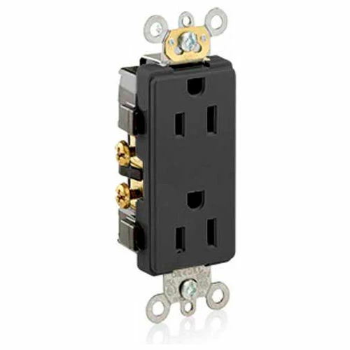15 Amp, 125 Volt, NEMA 5-15R, 2P, 3W, Decora Plus Duplex Receptacle, Straight Blade, Commercial Grade, Self Grounding, Side Wired, Steel Strap, Black