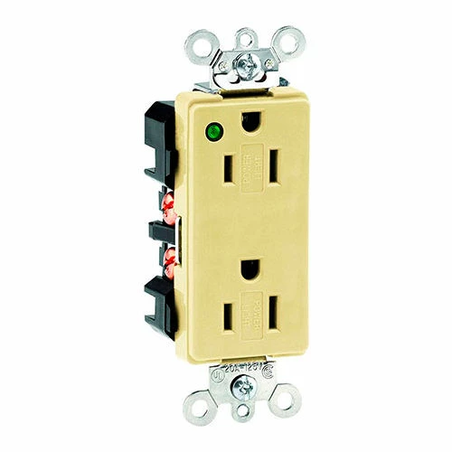 15 Amp, 125 Volt, NEMA 5-15R, 2P, 3W, Decora Plus Duplex Receptacle, Straight Blade, Hospital Grade, Self Grounding, Power Indication, Back and Side Wired, Nickel Plated Brass Strap, Ivory