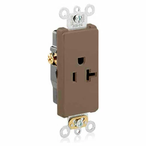 20 Amp, 125 Volt, NEMA 5-20R, 2P, 3W, Decora Plus Single Receptacle, Straight Blade, Commercial Grade, Self-Grounding, Back and Side Wired, Steel Strap, Brown