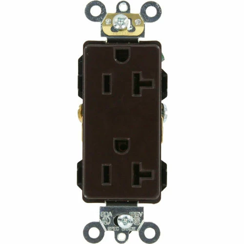 20 Amp, 125 Volt, NEMA 5-20R, 2P, 3W, Decora Plus Duplex Receptacle, Straight Blade, Industrial Grade, Self Grounding, Back and Side Wired, Steel Strap, Brown