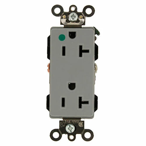 20 Amp, 125 Volt, NEMA 5-20R, 2P, 3W, Decora Plus Duplex Receptacle, Straight Blade, Hospital Grade, Self Grounding, Back and Side Wired, Steel Strap, Gray