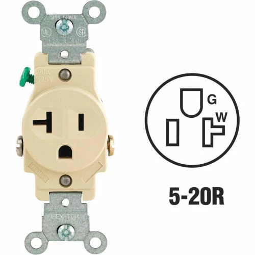 Leviton 5801-I 20A, 125V, NEMA 5-20R, 2P, 3W, Single Recpt., Grounding, Ivory – Pkg Qty 10