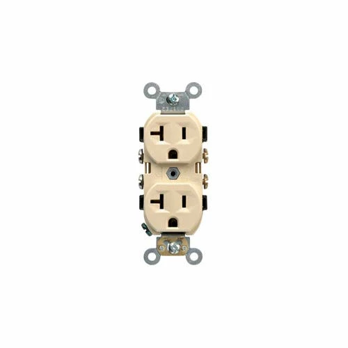 20 Amp, 125 Volt, NEMA 5-20R, 2P, 3W, Narrow Body Duplex Receptacle, Straight Blade, Commercial Grade, Self Grounding, Side Wired, Steel Strap, Ivory
