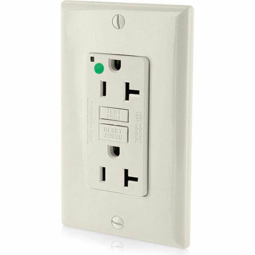 20 Amp, 125 Volt, SmartlockPro Slim Self-Test GFCI Receptacle, Extra-Heavy Duty Hospital Grade, NEMA 5-20R, 20A Feed-Through, 2P, 3W, Matching Wallplate Included – Lt. Almond